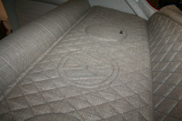 Anyway. Forsetter med sying fortsatt. Snart ferdig frem til B-posten nå. Mye ekstra mas for å få sydd hattehylla i samme look'en. Særlig logo'en var lei. Det vrei seg og holdt på. Så måtte plukke opp en gang og begynne forfra. Til slutt ble den temmelig rund og med riktige proporsjoner. Litt kilent å få ting i riktig rekkefølge, da jeg skulle ha gitter til høytalere under stoffet og avstiving av tre under, samt sy inn kraftig vinyl under stoffet der plata festes til seteryggen. Vanskelig å få plata gjennom maskin med trevirke under  Gliser