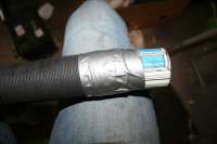 Fikk på de hersens røra ned på kanalen i går. Det var for trangt mellom flensen på varmerøret og A-posten. Pappen bygde for mye. Så det ble å leke litt Reodor. Hva hadde man i verkstedet i samme dim? Patroner til vinduskitt! Skar av et par 10 cm'ere og prøvde de ned på flensen- trangt og fint. Gikk faktisk å få ned armen fra oversiden, og angret på at tynn-stoffet allerede var sprøytet på (klissete til albuen!). Så da kortet jeg inn papp-røret, plaststussen på med litt alu på utsiden som forsterking, og så duct-tape for å binde det sammen. Samme innvendig diameter, men mye tynnere vegger!