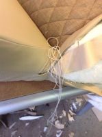Har 3 dager fri, og håper å komme i mål med seteputene ila torsdag. Får se hvor langt jeg kommer. Bruker fransk søm, som det kalles, når jeg føyer sammen setet. Syr i hop, bretter det ned flatt og syr langs sømmen på begge sider. Det er ganske pent (og velkjent på bilseter), men det påfører ganske mye belastning på stingene i midten. Ett rift i tråden, og alt revner ganske fort. Ikke ukjent på nyere biler, heller. Tråden er som regel det første som går. Derfor legger jeg under en remse med sterk vinyl når jeg syr det ned flatt. Så sprer strekket seg over flere sømmer, og sømmen i midten "spriker" ikke så mye heller som det ellers lett gjør når alt henger i midtsømmen.