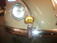 Jeg har montert lykter på min nye 65 mod. De er ca 4" tror jeg med gule glass. Jeg syness selv de ble helt perfekte. VW Veterandeler har disse og festene. Tror jeg betalte ca 2000,-kr for lykter med fester. Dette er spesialbestilling som ikke ligger i nettforetningen tror jeg.