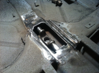 Da var det bare å gyve løse igjen. Ville ordne dette før det kom lakk på bilen da det ble litt kapping og sveising i gulvet. Denne måtte senkes slik at riktig avstand ned til akslingen bakover ble riktig.