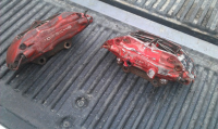 Bremsedeler jeg har planer om å bruke. Trenger litt ny lakk å smørning, men det blir nok saker etterhvert. Noen som har noe innspill på hvordan jeg burde lakkere kalipperne slik at det holder?
