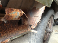 Tak, sidepanel, ramme, alt det elektriske og vinduer er bra, men det er rust i kanalene (det som er igjen nå) og motoren trenger en liten overhaling. Det er også litt rust noen steder i innerskjermene og litt overflaterust på gulvet baki samt nederste del av dørene. I tillegg er det litt arbeid på frontplaten, men mest småsveising, litt banking og sparkling (håper jeg).