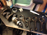 Har ikke fått ut bolten fra toppen ennå, men har fått nye deler! Her er det meste av motoren og delene som skal sammen: