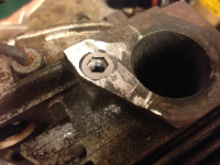 To av boltene til feste av eksosanlegg på toppene måtte skiftes ut, den ene manglet helt, den andre hadde gjengene rustet bort på. Forsøkte å skru ut bolten som satt igjen, men det gikk ikke så jeg kuttet den av og boret opp med et 4 mm bor. Forsøkte så å skru det ut med en tapp som har gjenger motsatt vei, men den knakk selvsagt, så nå er det ennå værre å få det ut. Mye hardere metall i den plugge som sitter i nå enn bolten som var der før Rekker tunge Får se hva jeg gjør med det. Aner ikke helt hvordan jeg skal få det ut.
