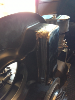 Som dere ser måtte jeg skjære ut litt på viftehuset for å få plass til den bredere oljekjøleren. Skal fabrikere og sveise på ny del i morgen.