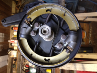 Ingen som kan svare på dette...? Trodde det var fler enn meg som har flippa spindler på bussen sin?  Det er helt sikkert at bremseslangem skal inn i ene pumpa, (derefor må du vri bremseskjoldet pga spindlene som nå er montert) -Har tegning av dette i instuksjonsboka til splitten min. (av vanleg spindel) - (1) pumpe i baktrommelen, to pumper i framtrommelen m forbindelsesrør, bremseslangen inn i den ene pumpa og ut m luftenippel i den andre. På bildet slik du har montert ser ein jo at du ikke har fjernet den plastpluggen som sitt i holet m luftenippelgjenger. (dersom det hadde vore muligt å få luftet desse bremsene så ville den plastpluggen fort komme ut når du trødde på pedalen...) Vel, vel, du må iallefall snu på bremseskjpldet så mykje at luftepluggholet har klaring til toppen av spindelen.