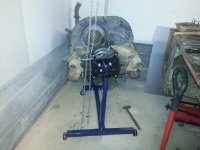 20130223_183149.jpg (99.04 KB. 761x571 - vist 317 ganger.) Jeg orker ikke å løfte motoren så jeg skrudde fast en 2x4" bjelke i taket og lånte meg en kjetting talje for å heise motoren opp i stativet: