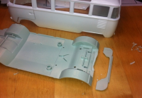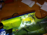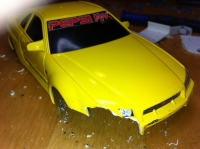 Da bussen er klar til lakking, tenkte jeg at det kunne være greit å ta en titt på en 1303 jeg lagde for 10 år siden. Den har fått litt juling, så det er litt sprekker og mye superlim etter mange runder på Arendal Raceway. Hullet i taket er etter etter en transponder. Tenkte å lappe dette så jeg kan lakke den samtidig. Blir ikke strøken, men det er ikke meningen heller.