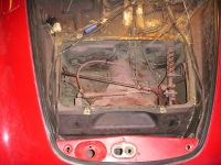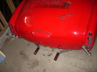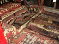 Nå har jeg fått av chassiet og satt opp karosseriet på at hjemmelagd stativ, - da blir det lettere å gjøre oppretterjobbene. Her er bilder av en del rust som jeg må gjøres noe med.
