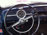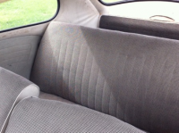 Innvendig ser den litt sliten ut. Førersetet har ødelagt rygg. Alle setene bør sikkert trekkes om, men fjærene er hele.