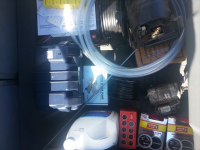 Her har det meste kommet på plass men fortsatt en del "justering" igjen. Trøblet lenge med hvordan jeg skulle løse intercooler plassering og oppheng. Fant en midlertidig løsning hvor den er hengt opp i ramma på høyre side. Selve kjøleopplegget går i egen krets da jeg ikke vil ha 80-90 grader på vannet gjennom den. Derfor kjøpte jeg bakre varmeregister til T4 på høgger'n, liten fin boks med vann inn og ut og vifte i samme kassa. Plasserte alt under baksete med vannpumpe fra Biltema. Ekspansjonstank fra T3... Vannpumpa er nok noe overkill da den sirkulerer 35 l/min, er redd det blir litt mye og at register ikke rekker å fjerne no varme. Eller at vannet ikke rekker å få varme fra intercooler. Osteaktig Men vi prøver, etter noe testing så kjenner jeg forskjell før og etter i alle fall.