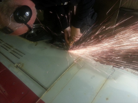 Stig i gang med å kappe vekk sparkel... rust... og en skikkelig dårlig sveise jobb. Noe som sannsynligvis har blitt gjort for 30 år siden...
