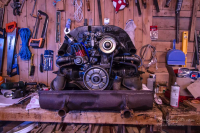 DA er motoren havnet på benken i snikkerboden  Gliser