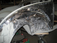 Takker for gode ord  Da har det skjedd litt ting igjen. Venstre innerskjerm har en gang i tiden vært utsatt for en real trøkk og hele quartreren er byttet til en nyere. Innerskjermen har feil fasong og jeg ville prøve å banke den i riktig fasong  . Det gikk egentlig ikke så verst, men det ville blidt mange sveiseskjøter og mange timer med hamring for å fått en fin og rett overflate. Så jeg stakk en tur til Raaen i dag for å hente en liten donor bit til innerskjermen. Tusen takk! Under tectylen var lakken som ny. Veldig fornøyd med det. Så ett steg frem og to tilbake. Men da blir det bra tilslutt  På tirsdag blir det å starte med sliping, måling og tilpassing for å finne ut hva som må kappes vekk. Vil ta så lite bit av bilen som mulig. Kapp og deng!