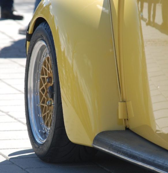 På med spacers Endre så er du vel i boks? Personlig liker jeg den bedre med de originale skjermene. Jeg kjører med 7x15 foran med 195/50 dekk på min 73 med ca 3 cm valsete skjermer: