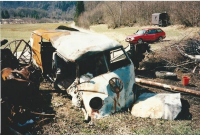 Spe på litt jeg og! Har bilde av en annen og som lå på samme plass som den nedenfor. Det var en sammenrast buss som hadde gått som taxi. Hadde dessverre ikke det liggende på photobucket kontoen. Får finne det senere. Planen var i følge eier å grave de ned. Dette var på midten av -90 tallet. Har ikke fått sjekket opp om det ble gjort  Denne stod på Knapphus. Mener den eksisterer enda. Følte den var skikkelig dårlig den gang! Manglet jo tross alt hele gulvet foran! Tidene har endret seg.......  Samme som Tom Ivar la ut.