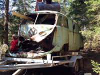 Vår alles kjære Mangokid tipset meg om denne for ca 15 år siden... Etter en første befaring dømte jeg den som fullstendig råtten og helt uten håp. Noen smådeler ble med hjem, men den brant seg fast baki hodet... Etter et par år, så hadde den "blitt bra nok" og den måtte hjem... Bakakslingen var borte...og det var rammevangene også. Med steinsvans bak en gammel M35, ble varebilden bare mer og mer vridd og mer og mer råtten...så enda en gang ble den dømt for dårlig... Men - som en slags siste gest, så skrev jeg mitt navn og nummer med sprittusj på den ene frontruta. Ett år senere fikk jeg plutselig en telefon... "vi driver og rydder en gammal gård her, og nå henger det en gammel folkevognbuss i gaflene på hjullasteren her...så ble vi var ditt navn og nummer som sto på den....skal du ha den?" ..... ehhh - ja! Jeg henter den i kveld..