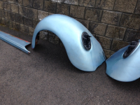 Da har jeg fått inn et bud på 1000kr for glassfiberskjermene. Her er et bilde av bakskjermene og stigtrinnet på den ene siden. Alle 4 skjermene følger selvsagt med samt stigtrinn på begge sider.