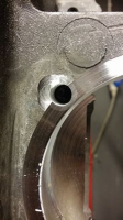 Om den ikke hadde vært borret opp allerede hadde aluhylse vært løsningen. Men dette er kun før maskinering. 1/100mm presspasning og min venn Loctite 638 løser problemet permanent.