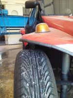 Hei! Trenger noen fornuftige innspill på hvordan jeg skal bli kvitt dette problemet. Det går greit når man kjører alene, men når man har en passasjer over 40 kilo, så skal det bare en oppbremsing inn mot et kryss eller et vanlig norsk telehiv før det skraper stygt fra passasjersiden. Jeg er klar over at dekkene stikker utenfor skjermene, og derfor har noe kortere vei fra fra dekk til skjermkant, men da jeg kjørte med "eu-kontroll-dekkene" endte det med at hjulet isteden traff innenfor skjermen og knuste undersiden av blinklyset i et overraskende asfalthull. Som buggyer flest er ikke denne heller helt rett. På høyreside sett forfra er det 7 cm fra dekk til skjermkant og på venstre er det 6 cm når ingen sitter i bilen. Hvor mye fjæringsvei er vanlig? Kan det være det holder å bytte til nye fjærer foran da det er mulig at de gamle er blitt litt slappe med årene, eller må jeg rett og slett bytte til puma-forstilling for å kunne justere opp litt? Kan en pumaforstilling bare justeres fra standardhøyde og nedover, eller kan den også øke bakkeklaringen?