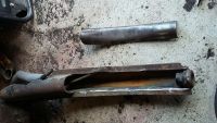 Jeg skar et spor (ca 30 cm) der hvor jeg hadde laget mer plass til drivknutene, og sveiste inn ei 3 mm plate. Den står da loddrett inni gaffelen. I tillegg har jeg kjøpt CUP stag fra CSP. Satser på at det blir stivt - ikke bur-nedi-gaflene stivt men bra nok til gate med litt motor.