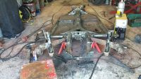 Tatt masse målinger av ramma og funnet alt rett og bra. Måtte jekke ut det ene dempertårnet litt da det var 0,5 cm utafor der det skulle være.  Sikkert fått seg en smell engang eller en tysker som var litt kjapp med sveisen Blunker