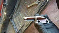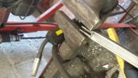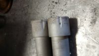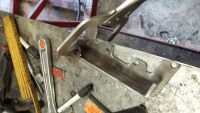 Dagens økt var å sandblåse div bakstillingsdeler og fikse litt på sanblåsekabinettet. Etter å ha blåst ting rene så jeg at boltene som holder svingarmene til indre feste var slitt og hadde groper ned i stålet.