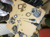 Idag ble eksosanlegget tatt av for å prøve å finne ut av hvorfor den etter-smelte ned hele lier bakken.... Hadde mine tvil på sveiste-varmepotter og at det var enderør-pakning på varmepotte til eksospotte. Men det viste seg og være at innsugvarmeren ble skrått festet til eksospotten slik at pakningen ikke ble tett. Bytta pakning på varmepotta til riktig og satte alt sammen. Prøvde å bøye ut innsugvarmerøret slik at det skulle treffe mer rett. Det blir jo bare midlertidig til jeg får renovert et kadron-sett. Fikk også satt på alurør til varmepottene. Så nå trengs bare justering av varmepotter hehe