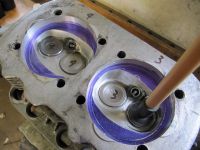 Etter at kammervolum hadde blitt satt, overflate polert og volum dobbeltsjekket ble nye eksosventiler og pent brukte innsugsventiler slipt til de gamle setene. Ideelt sett ville jeg skiftet styringer, særlig på eksos, men vi lar den gå for denne gang og ser hvordan motoren oppfører seg Blunker