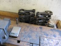 Stemplene var også ganske bra ut av esken. Her ble krysspinnene byttet om på til jeg hadde minst mulig diff, før den tyngste av dem blei dreid av en smule i ene enden. Stemplene m. krysspinner klokket inn med et totalavvik på ikke mer enn 0,3g uten behov for å fjerne gods utover det lille på den ene krysspinnen.