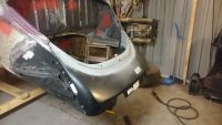 Gjort litt i kveld også. Tilpasset å helsveist den andre bakparten med støtfangerfestene. Selfølgelig sjekket at alt passer med motorlokk å bakplate. Får man gummilist som kan sitte på motorlokket å ikke rundt motorrommet? Det vil se så mye bedre ut