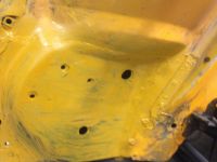 borret ut alle , behandlet og sveiset tilbake med 8 mm ptk . helsveist dette i topp og pkt. der det virker logisk .. på med 2 K grunning før event. karross skitt og Hagmans body (akryl ikke butyl basert ) . Etter dette er det klart for tynnstoff på baksiden .. Åpnet opp problemområde ved bakre fjærbeinsstøtte og kom til med sandblåsing/behandling  i overkant forsterkning . (tror att man kan komme til fra underside tank også tildels ) . Inne i selve forsterkningen ser det bra ut , noen har tatt seg bryet med tynnstoff her noen år tilbake  Glad