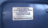 kjøpte en jubileumsmodell i fjor høst, den sto bare 12 km unna. forrige eier hadde kostet  på mye men amatørmessig arbeid. forhjula hadde spissing på 30 mm, hele bilen rista over 60 km/h. han hadde bytta kam, forgasser og bensintank og teipet over rust. lakkert og kostemalt litt her og der. har gått over hele bilen i sommer, sveiset rust i gulv og innerskjermer og rundt forstilling. bygd om til skiver  og senket litt foran.nye teppesett og restaurert alle seter. den er solgt ny som1300 i vognkortet men det satt1600 motor i den som enda ikke går  som den skal. skal bytte gearkasse for å få riktig utveksling.og clutch.(ulåt i utløserlager). skulle også vært hellakkert, men det får komme siden. var mye rart med det elektriske også men nå går det hvertfall an å skru av vindusviskerne selv om batteriet tappes når den står stille over 2 uker. nr er 2103. skal bli sommerbil til kona.