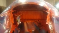 Så blir det å slipe/ matte ned motorrommet utenom rundt rammene da det ble gjort i stad, før grunning og lakkering av motorrommet.  bakskjerm spissene får en runde med steinsprut beskyttelse før lakk.
