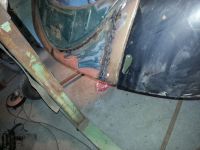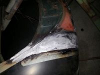 Frua rakk å slipe blank ei dør før krampa tok henne ;-) i kveld, fikk jeg besøk og GOD hjelp av en kompis, Arne , som slipte blankt panseret og høyre bakskjermen+ hjalp meg å justere inn venstre forskjermen skikkelig. det gjorde at jeg fikk fullført bakplata, justert og sveisa den fast, slipt sveiser, og tinna alle skjøter og slikt på bakplata, da kan jeg slipe tinn å sparkle den klar i mårrakveld etter jobb tenker jeg . fikk og sveisa ferdig alle småhulla i bakskjerma til div lampefester. da er det klart til å borre nye hull etter hvert der og.