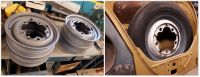 Har fått sandblåst fire felger som alle er fra 58 modeller. Trengs noen nye klips for hjulkapslene. Reservehjulet har en av originalfelgene fra denne bilen var ny, og ser så pass bra ut at jeg foreløpig velger å beholde det urestaurert.