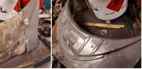 Skjøtet også sammen bakplaten fra delebilen. Den var kuttet i to siden de sikkert ikke hadde planer om å bruke den. Men slik jeg har forstått er ikke disse bakplatene så lette å få tak i med riktige H-profilen og to eksosutløp. Regner med jeg flytter over H-profilen til en repro, viss ikke det dukker opp en bra original.