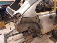 Fikk litt mer bilder fra verkstedet. Bilen har fått tilbake sin opprinnelige form. Nå passer både skjerm, motorlokk og bakplate til karosseriet. Er fremdeles mye småbulker, så en del blikk må selvfølgelig byttes. Men hovedformen er slik at man kan jobbe videre med det.