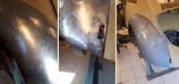 Lenge siden nye bilder, så da blir det litt av venstre bakskjerm. Som nevnt tidligere er jo dette den eneste skjermen som har overlevd siden bilden var ny. Selv om den har overlevd var den ikke helt frisk. Den hadde fått en knekk midt over hjulet som hadde vært sveist på 60 tallet. Måtte kutte bort det som var rustent og rullet til en ny bit med det engelske hjulet. Ser ikke ut som mye bue, men med linjalen på. ser man at det er en del. Festet først med magneter for å merke kuttlinje.