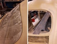 Måtte sjekke om bakvindu passet siden jeg ikke hadde testet det etter opprettingen. Hadde tidligere sett noe som virket litt skjevt, og det stemte. Øvre høyre hjørne har nok blitt litt presset ut/opp når bakenden ble trykket inn i kollisjonen. Laget et solid flattjern som jeg kunne klemme fast oppe i hjørnet.