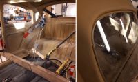 Måtte teste lufthammeren som jeg lagde. På panseret ser man tydelig merkene etter hammeren de har rettet med en gang i tiden. Etter et par minutter med lufthammeren ble det nesten borte.