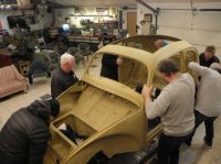 Hadde en samling i garasjen med andre veteranbilfolk, så da benyttet jeg anledningen til å få løftet karosseriet opp på bunnplata igjen.