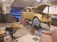 Hadde en samling i garasjen med andre veteranbilfolk, så da benyttet jeg anledningen til å få løftet karosseriet opp på bunnplata igjen.