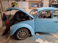 Nok en lang ettermiddag/kveld i garasjen i går, og en av punktene på lista var vindusvisker. Når vi kjøpte denne bilen (em '68 modell) fikk vi med et karrosseri som var i betydelig bedre stand enn det originale, og vi har kommet til at det er fra en '69 eller '70 modell. En av forskjellene ser ut til å være vindusviskermotoren, så den han hadde fra '68 passet ikke (selve motoren tok i karosseriet i bakkant av panseret). Heldigvis er det flere VW-entusiaster i området, og Johnny som bor rett borti gata hadde en liggende, som både passet og virket Glad