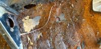 Atle gjør i utgangspunktet all jobben selv, mens jeg er med som håndlanger og gir gode råd underveis. Når gulvene var fjernet fant vi litt rust på delene som gulvet skal sveises inn i, og da ble det laget noen små patcher som han sveiset inn: