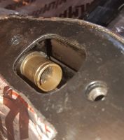 Litt fremdrift har det vært de siste dagene, og det er endene av "napoleonshatten" som har fått litt omsorg. Det var rustet hull på undersiden, og det viste seg at avstandsstykkene som ligger inni var rustne, så da fyrte han opp dreiebenken og laget 4 hylser som ble lagt inn før det ble sveiset igjen fra undersiden:
