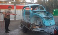 Så da snudde mekanikeren (Atle) fokuset mot karosseriet igjen, og vi hadde besøk i garajen en dag av han som skal hjelpe oss å lakkere, så da tok vi en del beslutninger; bla a. at for å sikre at det blir samme farge på alt, så matter vi ned og lakkerer selve karosseriet også når vi først er i gang.