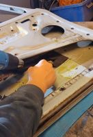 Det sparkles og slipes litt på alle kanter på bilen, men det er jo ikke så veldig spennende å vise bilder av, men han fikk tatt av døra og plukket av støydempingsmatta på baksiden, så da er døra klar til å repareres: