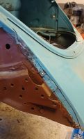 Siste litt store operasjon før klargjøring til lakk er å fikse "quarter panel" på venstre side. Her kan man se at skjermen ikke ligger innat karosseriet: